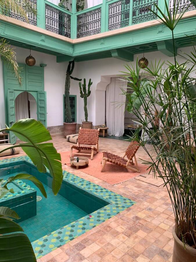 This riad offers generous living spaces and a harmonious layout organized around a large, particularly bright central patio.