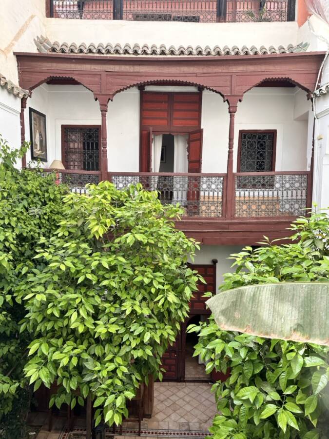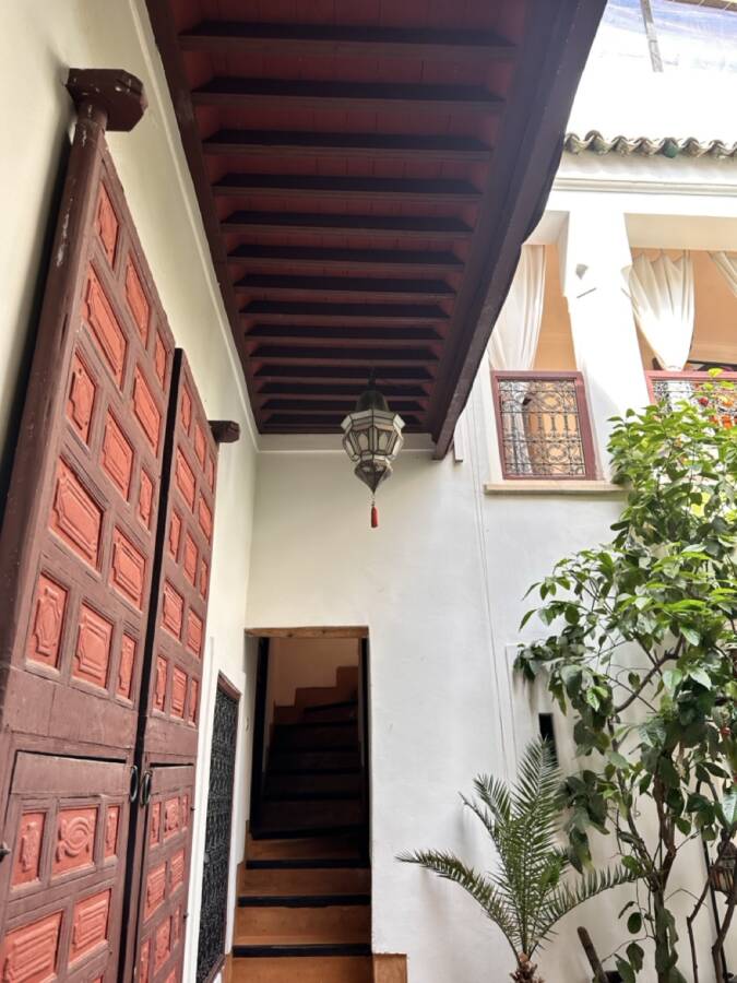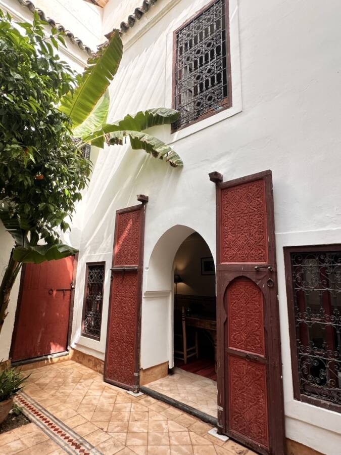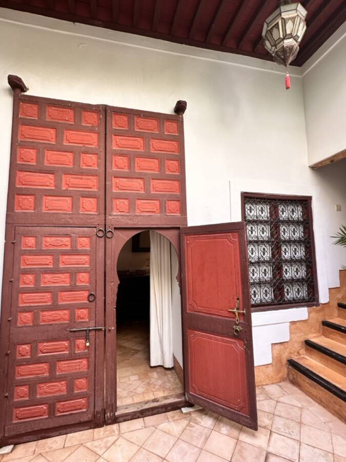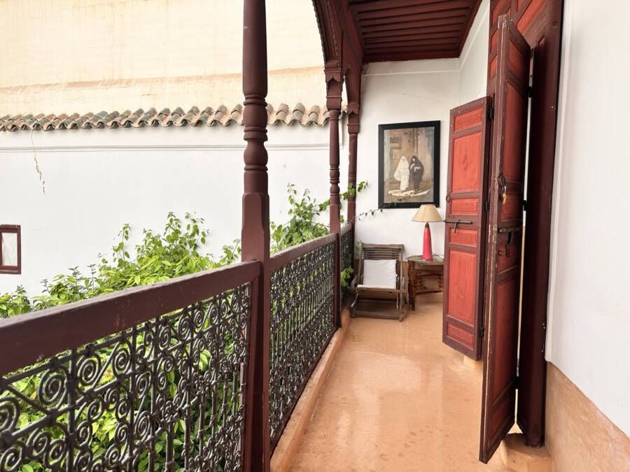 This riad was selected by Quentin Wilbaux and his team in the late 1990s for its traditional classical architecture, its proportions, and its original architectural details (wrought ironwork, khokha doors, cedar gallery, carved plasterwork with its original natural pigments, brick arches and columns, etc.). It has been featured in several publications due to these remarkable characteristics.
