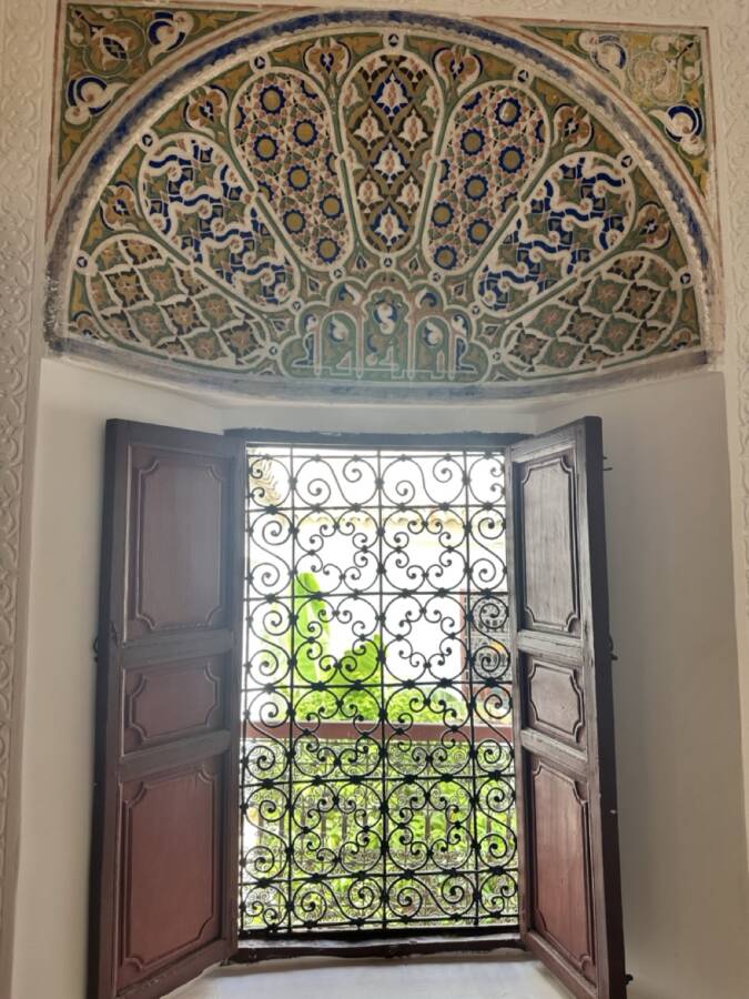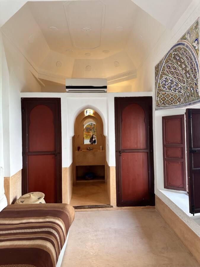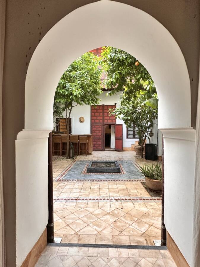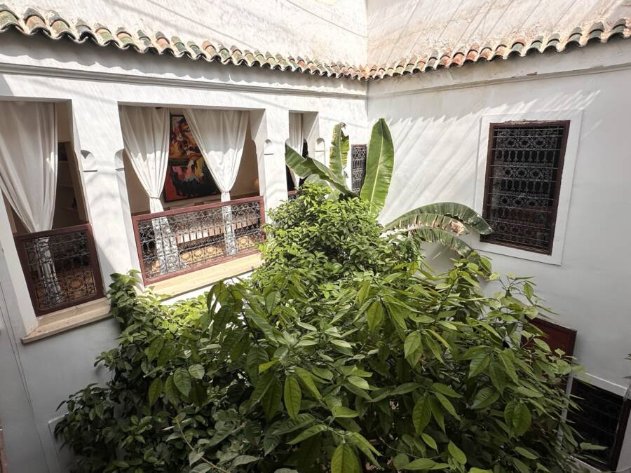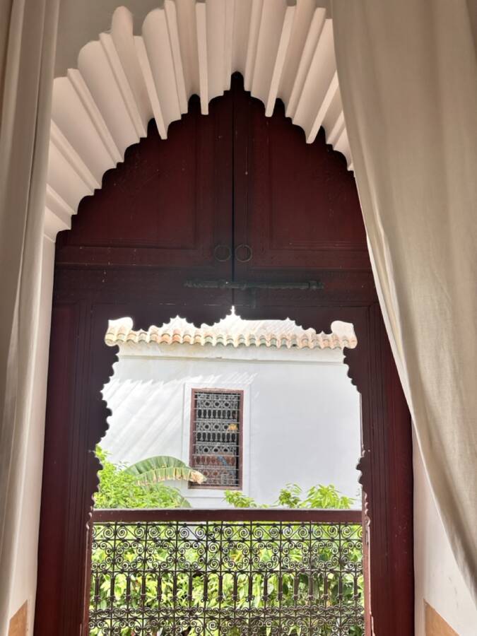 This riad was selected by Quentin Wilbaux and his team in the late 1990s for its traditional classical architecture, its proportions, and its original architectural details (wrought ironwork, khokha doors, cedar gallery, carved plasterwork with its original natural pigments, brick arches and columns, etc.). It has been featured in several publications due to these remarkable characteristics.