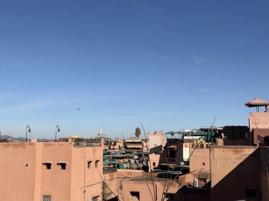 La terrasse offre une vue panoramique directe sur l’animation de la place Jemâa el-Fna et, au loin, sur les cimes de l’Atlas.