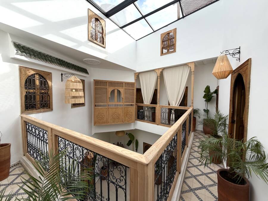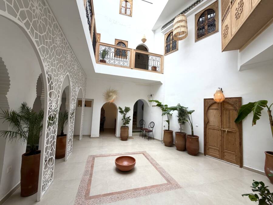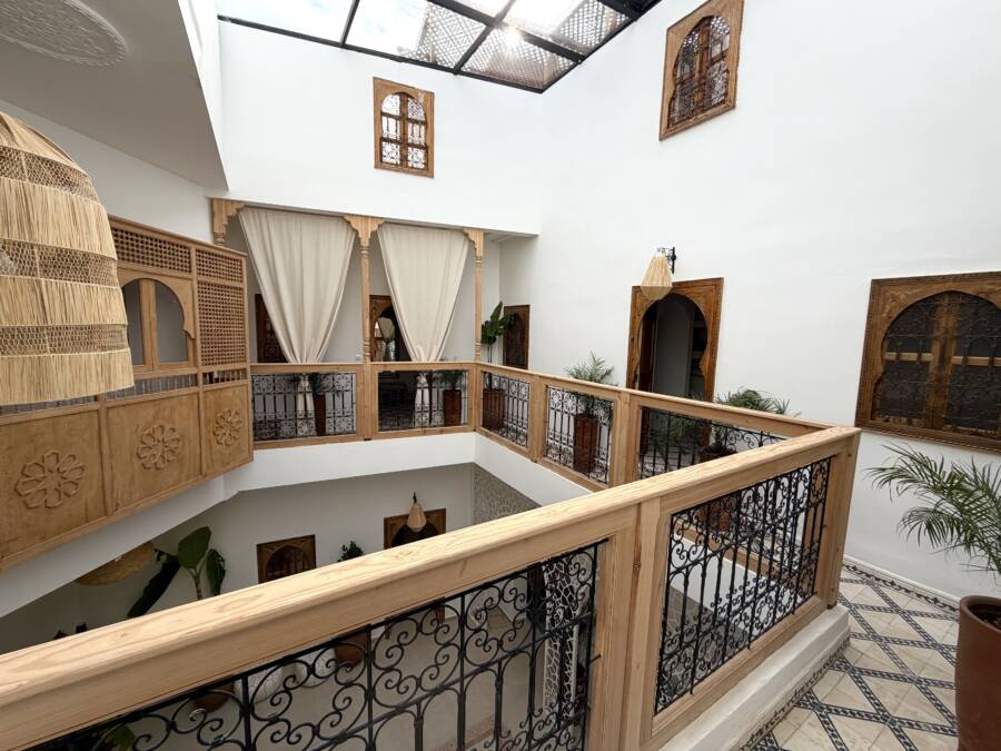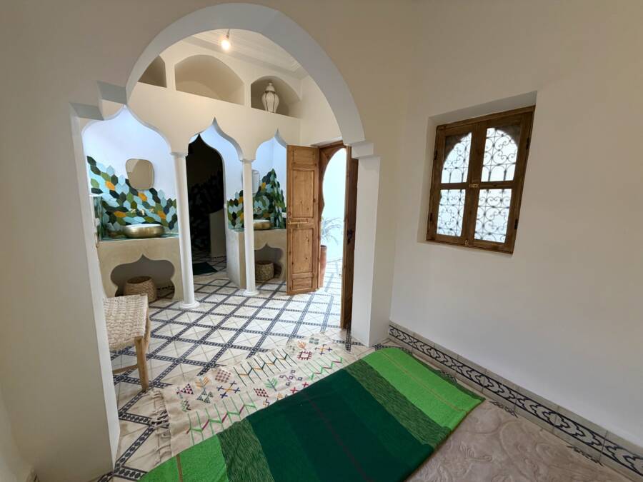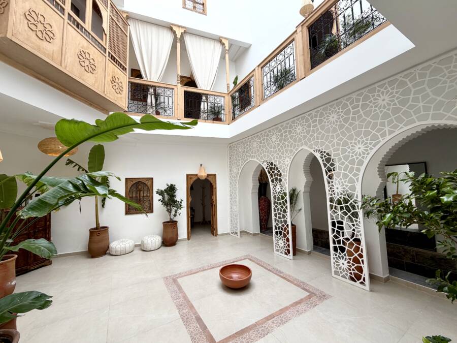 Dès l’entrée, vous découvrez un patio couvert, véritable pièce de vie centrale, offrant un espace chaleureux et utilisable toute l’année. Grâce à sa conception, le riad bénéficie d’une luminosité exceptionnelle et d’une circulation fluide entre les espaces.