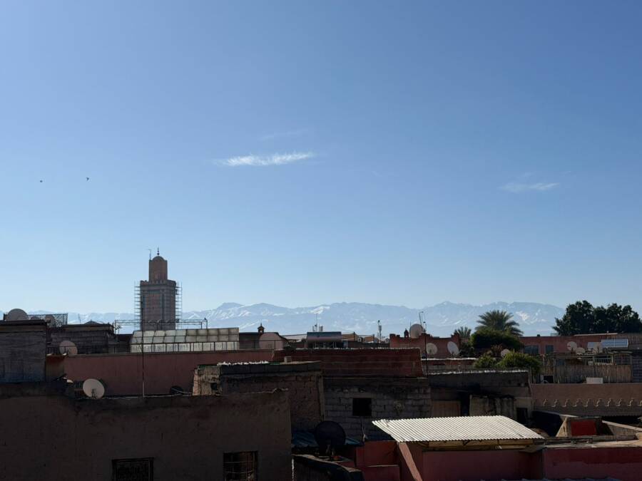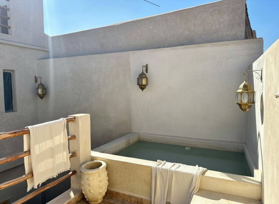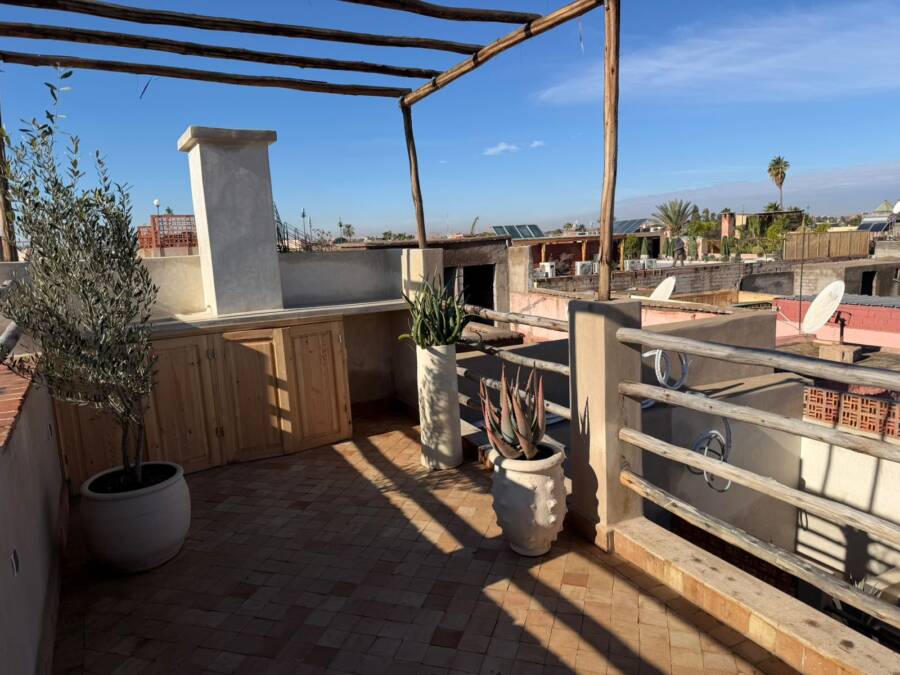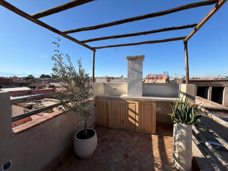 Un petit bassin en terrasse pour se rafraichir et une sur terrasse avec un coin cuisine qui domine la médina avec une magnifique vue sur l’Atlas.